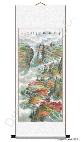 The title of this Chinese landscape painting means mountain clouds singing springs arrival.