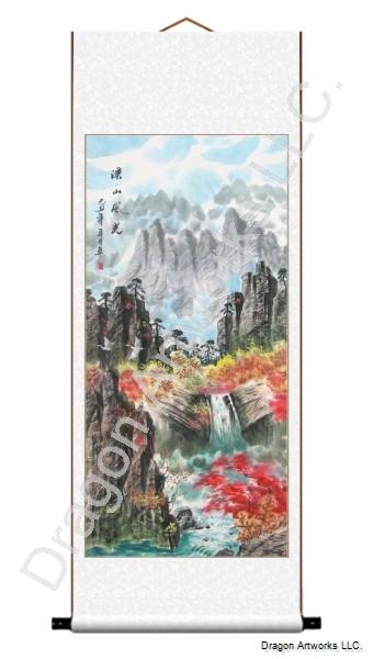 Mountains and rivers have been a couple of traditional subjects for Chinese landscape paintings since the eleventh century. In this Chinese landscape painting, the waterfall is so vividly drawn that it seems that you even can hear the sound raised from the falling water