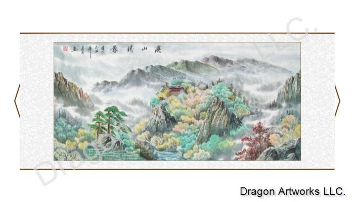 On this Chinese landscape painting the flowing stream, the groups of mountains, the gleaming hut, as well as the boundless sea of clouds make this painting beautiful with a flavor of mystery. This Chinese landscape painting shows us a very beautiful mountain streams scenery in spring.